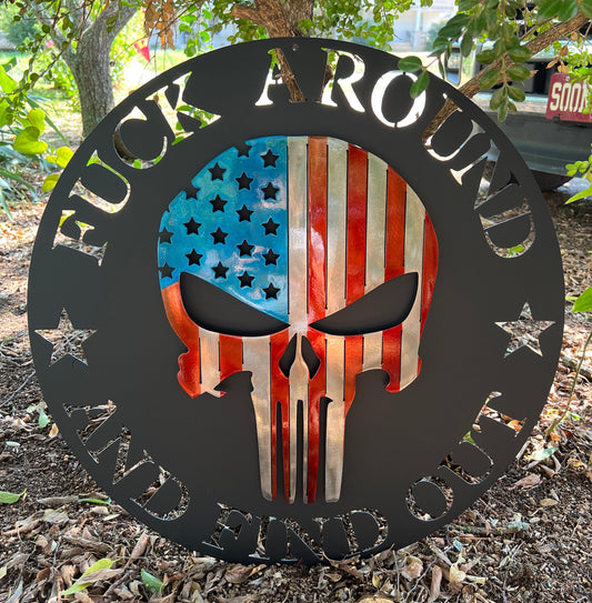 "F Around and Find Out" American Flag Punisher Skull Metal Sign (C85)