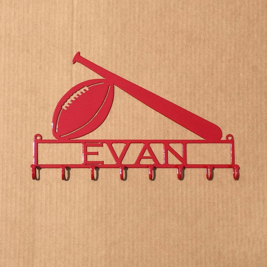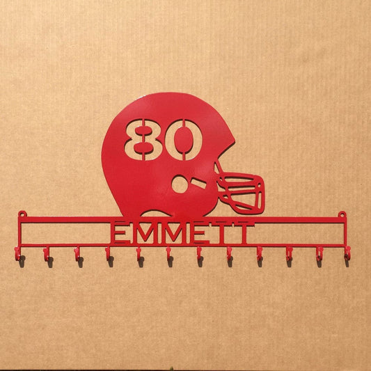 Football/Baseball Medal Rack with Personalized Text Box and 8 Hooks (K23)