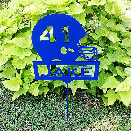 Football Helmet Garden Stake with Custom Text Box and Your Number in the Helmet (A28)
