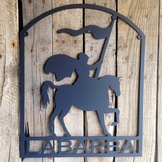 Metal Art Knight on Horse with Flag and Custom Text Sign (L15)