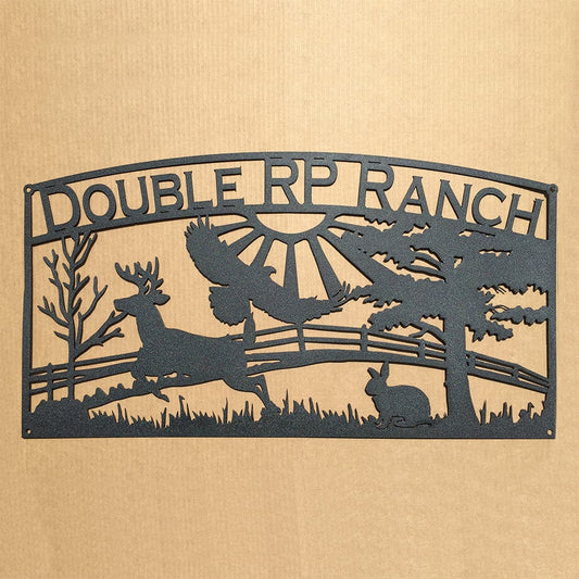 Metal Art Ranch Sign with Eagle, Buck, Rabbit, and Custom Text Field (A25)