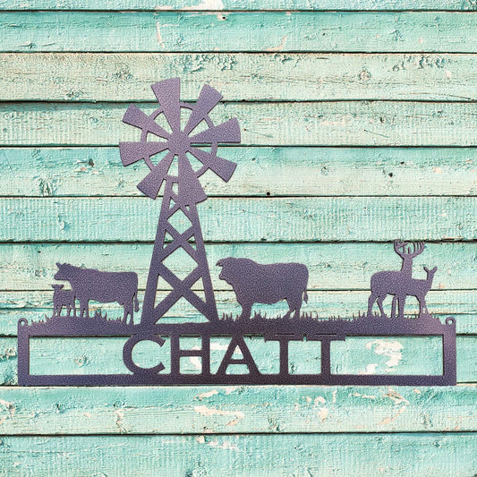 Metal Art Windmill with Cows and Deer Custom Text sign (G12)